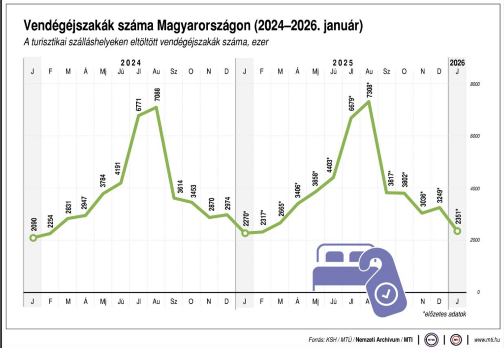 2025-ben rekordévet zárt a hazai turizmus, a minden korábbinál nagyobb számú – 20 millió – vendég, minden korábbinál több, mintegy 47 millió vendégéjszakát töltött a magyarországi szálláshelyeken. Az idei év is jól indult, januárban a vendégek száma 5,3 százalékkal, míg az általuk eltöltött éjszakáké 3,6 százalékkal bővült az előző év azonos időszakához képest, ez kedvező kiindulási alap, hogy 2026-ban tovább nőjön a hazai turizmus – írta a legfrissebb statisztikai adatokhoz fűzött kommentárjában a Nemzetgazdasági Minisztérium (NGM).