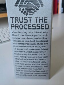 Új, „trust the processed” („bízz a feldolgozottban”) felirat jelent meg az Oatly zabitalain. A svéd márka tavaly vezette be a címkét, amely nyíltan reflektál az ultrafeldolgozott élelmiszerekről (UPF) szóló, egyre élesebb vitára.