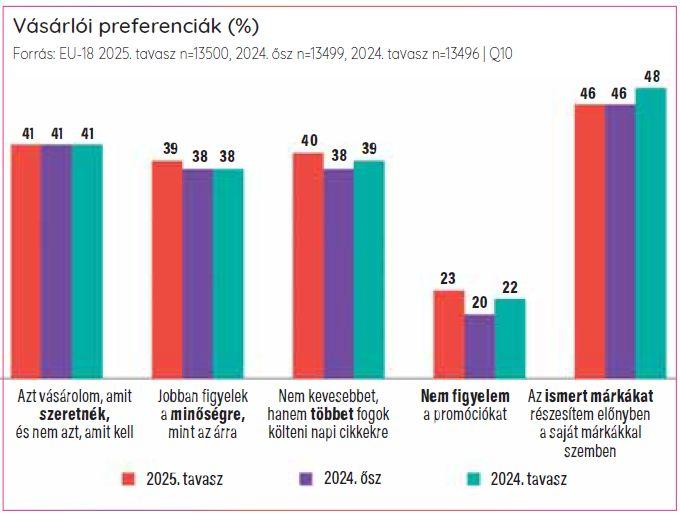 Idén tavasszal tízből négyen nyilatkoztak úgy, hogy inkább azt vesznek, amit szeretnek, mint azt, amire szükségük van, és emelkedett azoknak az aránya is, akik a minőségre jobban odafigyelnek, mint az árra. A vásárlók 40%-a tervez többet költeni napi cikkekre, és a tavaly őszi 20%-hoz képest 23% hagyott fel azzal, hogy vadásszon a promóciókra. Változatlanul 46% azoknak az aránya, akik a saját márkákkal szemben az ismert márkákat részesítik előnyben.