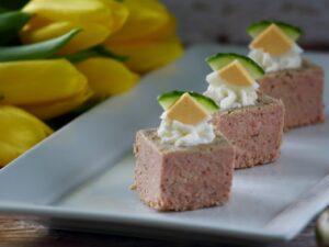 Az alap hozzávalóit alaposan összedolguzzuk. Kiolajozott 25 darabos kocka zila formába töltjük. 150°C-os sütőben 40 perc alatt megsütjük. Kihűtjük. Elávolítjuk a formát. A töltelékhez a kókuszolajat és a ToTu krémet összekeverjük. Akkor jó, ha vaj állagot kapunk. Sóval, törött borssal, ecetes tormával ízesítjük. Csillagcsőrös habzsák segítségével megtöltjük vele a kockákat. Negyedbe vágott főtt tojás és uborka szeletekkel díszítjük. Tálaláskor szeleteljük.