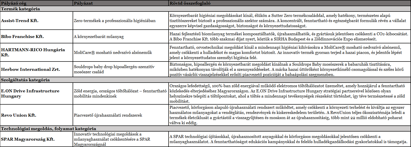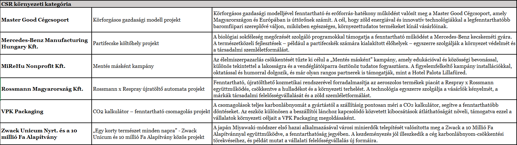Az alábbi táblázatban a Fenntarthatóság Szimbóluma 2025 nyertesei, valamint pályázatuk rövid leírása olvasható.