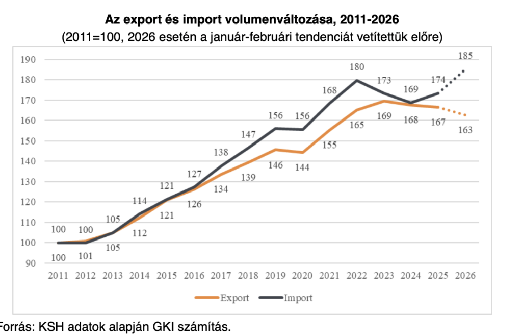 2018-19-től kezdődően az import volumenének növekedési üteme tartósan felülmúlta az exportét. Bár 2024-ben az import markáns visszaesése következtében a két mutató 2011-es bázishoz viszonyított értéke átmenetileg szinte teljesen kiegyenlítődött, ezt követően az olló ismét kinyílt. Az aktuális 2026-os adatok alapján ez a szétválás a jövőben tovább mélyülhet, ami érdemben rontja a külkereskedelmi mérleget.