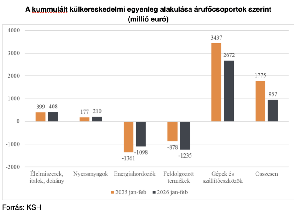 Az energiahordozók behozatalának kumulált forgalma 2026 első két hónapjában 466 millió euróval, míg kivitele 202 millió euróval mérséklődött az előző év azonos időszakához képest. Bár az energiahordozók nettó importja összességében csökkent, az iráni konfliktus nyomán kialakult energiapiaci árnövekedés és az eddigi alacsony importszint miatt a tárolók feltöltésére várhatóan már megemelkedett árakon kerül sor, ami a közeljövőben rontani fogja a külkereskedelmi mérleget.