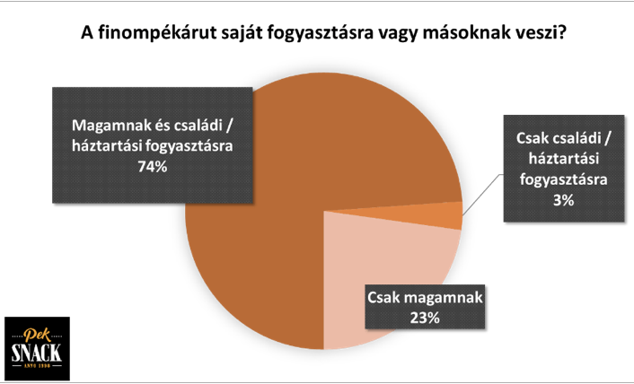 Az is jól látszik, hogy a finompéksütemények beszerzésének a legtöbb családban kialakult gyakorlata van: azok, akik ilyen termékeket vesznek, a legtöbbször nemcsak maguknak, hanem az egész háztartásnak beszerzik a szükséges mennyiséget. A finompékárut vásárlók 73,9 százaléka nemcsak saját fogyasztásra, hanem a háztartás számára is vásárol, míg kizárólag magának csupán 22,8 százalék visz ilyen terméket. Ez arra utal, hogy a kategória nem pusztán impulzusjellegű, hanem a tudatos, rendszeres bevásárlási döntés része.
