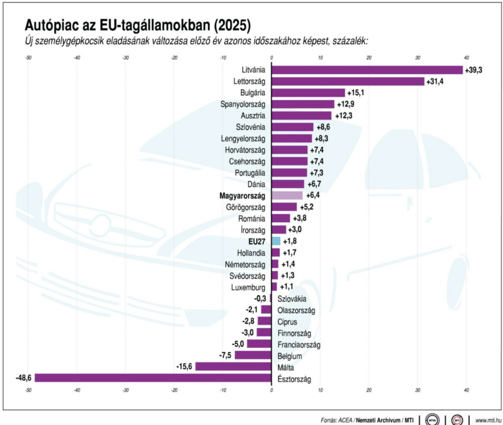 Magyarországon 129 440 új autót adtak el tavaly, 6,4 százalékkal többet a 2024. évinél. A dízeles autók eladása 2 százalékkal, 14 374-re csökkent, míg a benzineseké 14,8 százalékkal, 30 920-ra esett. A BEV-autók eladása 28,5 százalékkal, 11 002-re nőtt, a hálózatról is tölthető, plug-in hibrid (PHEV) autóké 25,3 százalékkal, 7136-ra, míg a hibrid-elektromos (HEV) autóké 16,7 százalékkal, 65 369-re bővült.
