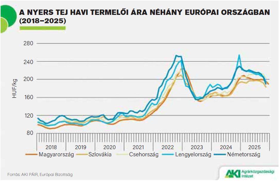 A nyers tej termelői ára nemzeti valutában kifejezve 2025 novemberében az Európai Unióban 6%-kal, Új-Zélandon 10%-kal, az USA-ban 19%-kal csökkent az előző év azonos hónapjához képest.
