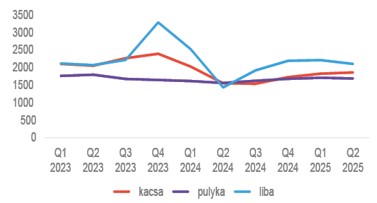 A pulykahús átlagára 2022–2023-hoz képest mérséklődött, a tavalyi év folyamán azonban folyamatosan nőtt, különösen az utolsó negyedévben. Ezzel párhuzamosan a vásárolt mennyiség is csökkent, és az ünnepi időszakban 13%-kal maradt el az előző év azonos időszakától.