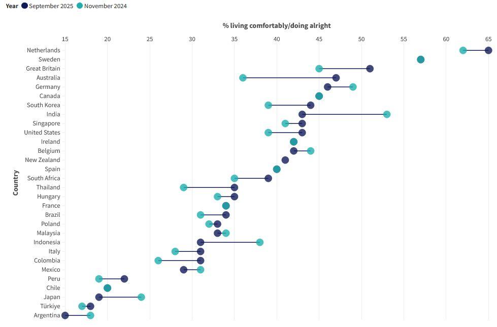 Az egyes országokban önmagukat anyagi biztonságban érzők aránya 2024. novemberben (világoskék) és 2025. szeptemberben (sötétkék)