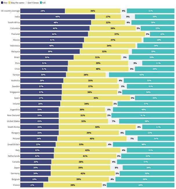 Franciaországban (66%), Kanadában (60%) és Brazíliában (55%) rekordmagasságba emelkedett azok aránya, akik szerint nőni fog a munkanélküliség. Az előző évhez képest Franciaországban és Brazíliában 8%ponttal, Kanadában és Írországban 10%ponttal többen pesszimisták a kérdést illetően.